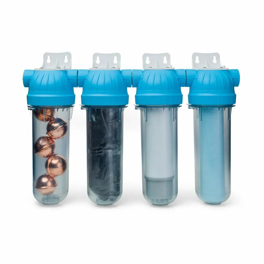 System rurowy czterostopniowy 10″ Wyposażony w ciśnieniomierze oraz komplet przyłączy, wykonany z komponentów NSF i WRAS. W zależności od jakości wody, system można dowolnie konfigurować za pomocą wkładów: mechanicznych, specjalistycznych lub węglowych.